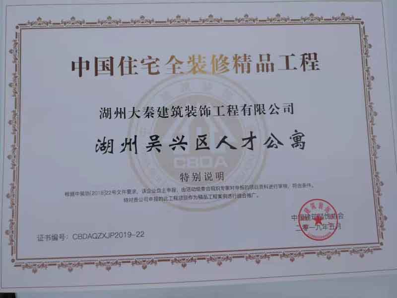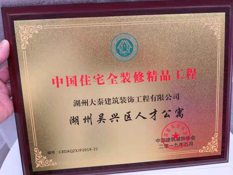 2019年5月22日參加了中國建筑裝飾協(xié)會組織的首屆中國全裝修精品示范工程頒獎大會,我公司《吳興區(qū)人才公寓精裝修工程》榮獲首屆中國住宅全裝修精品獎。